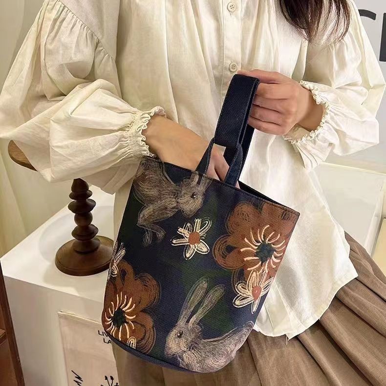 文藝感刺繡水桶包~小清新手拎帆布袋「兔兔在花叢裡撒嬌」 👉12/29日結單  | [分享商店] 得速精緻百貨