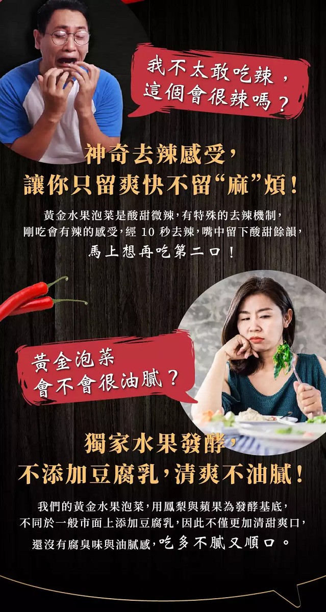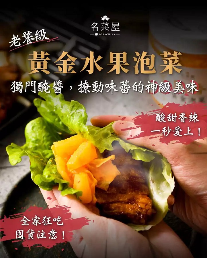 合購介紹 併1:名菜屋黃金水果泡菜***鳳香, 脆蘋, 柚香甜大根---大白菜獨家厚工重本製作,酸香、辣韻、蜜甜、爽口多層次,愛好者必吃的神級泡菜 |