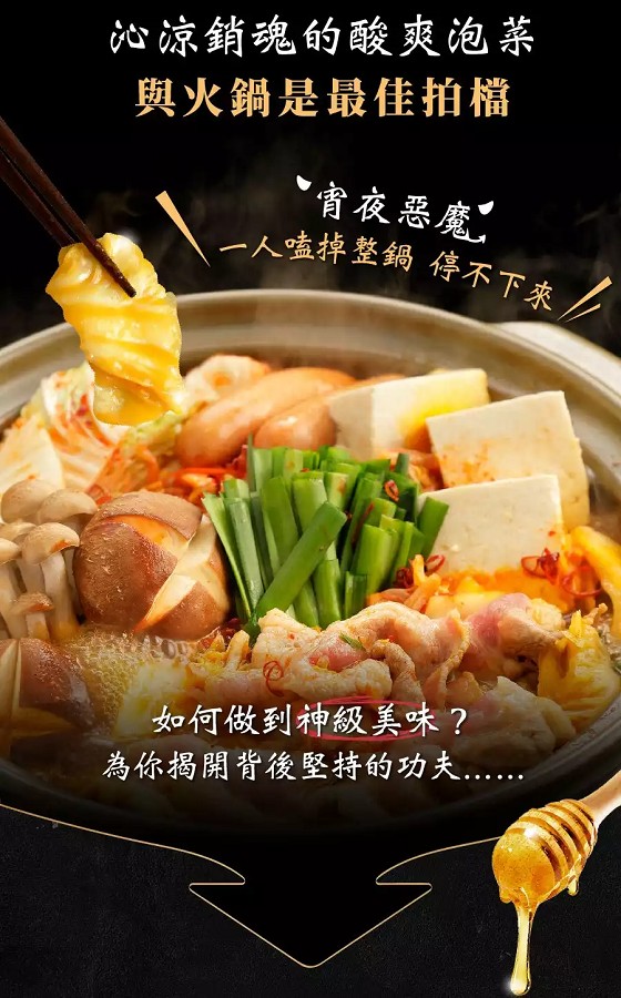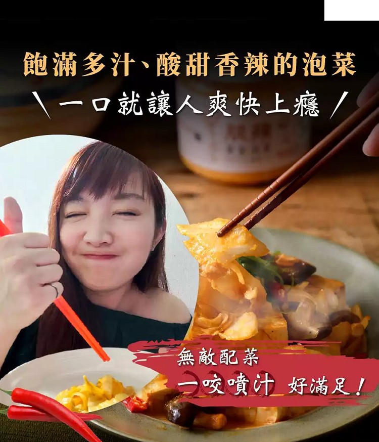 採用名家翠玉大白菜,經獨家厚工重本製作,酸香、辣韻、蜜甜、爽口多層次,泡菜愛好者必吃的神級泡菜!