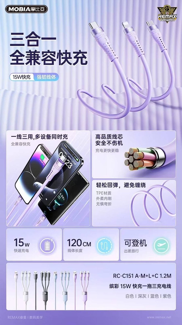 2/5(一)到貨 繽彩 15W 快充一拖三充電線1.2M  |