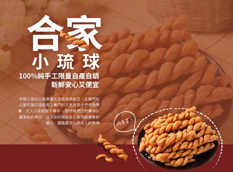 合家的麻花捲純手工製作,吃起來又香又脆又厚實,只要咬一口,就會上癮。甜甜又飽滿的口感,更有多種口味可選擇,其中煉乳、可可、海苔等創意新口味,也 | [分享商店] 小琉球合家麻花捲