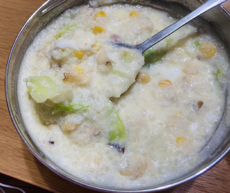 🟢雞蓉玉米粥-雞肉鮮嫩、玉米香甜,風味清爽、營養滿分大小朋友都會喜歡,輕鬆加水煮開 再打顆蛋花 最後撒上蔥花胡椒,一碗道地鹹粥就上桌!