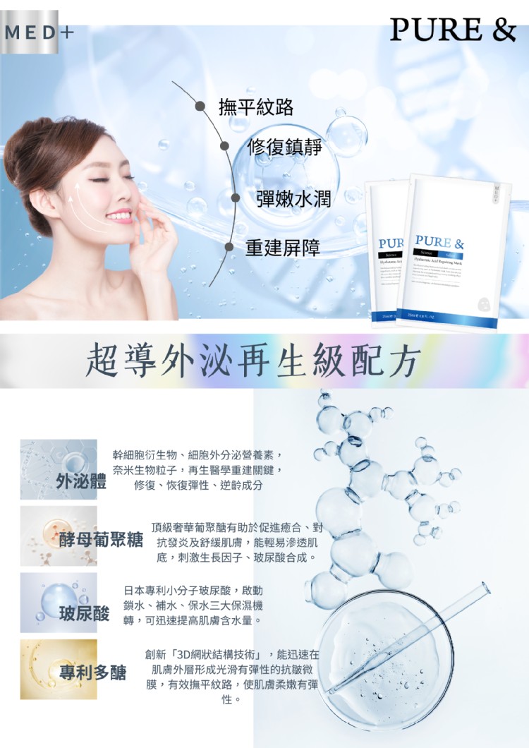 敷上PURE&玻尿酸面膜,閉上眼睛,感受精華緩緩滲透肌膚,10分鐘後揭下面膜,妳會發現肌膚如嬰兒般細嫩光滑。不僅是水潤,更有一種從內而外的亮澤感,仿佛每一個毛孔都在呼吸。
