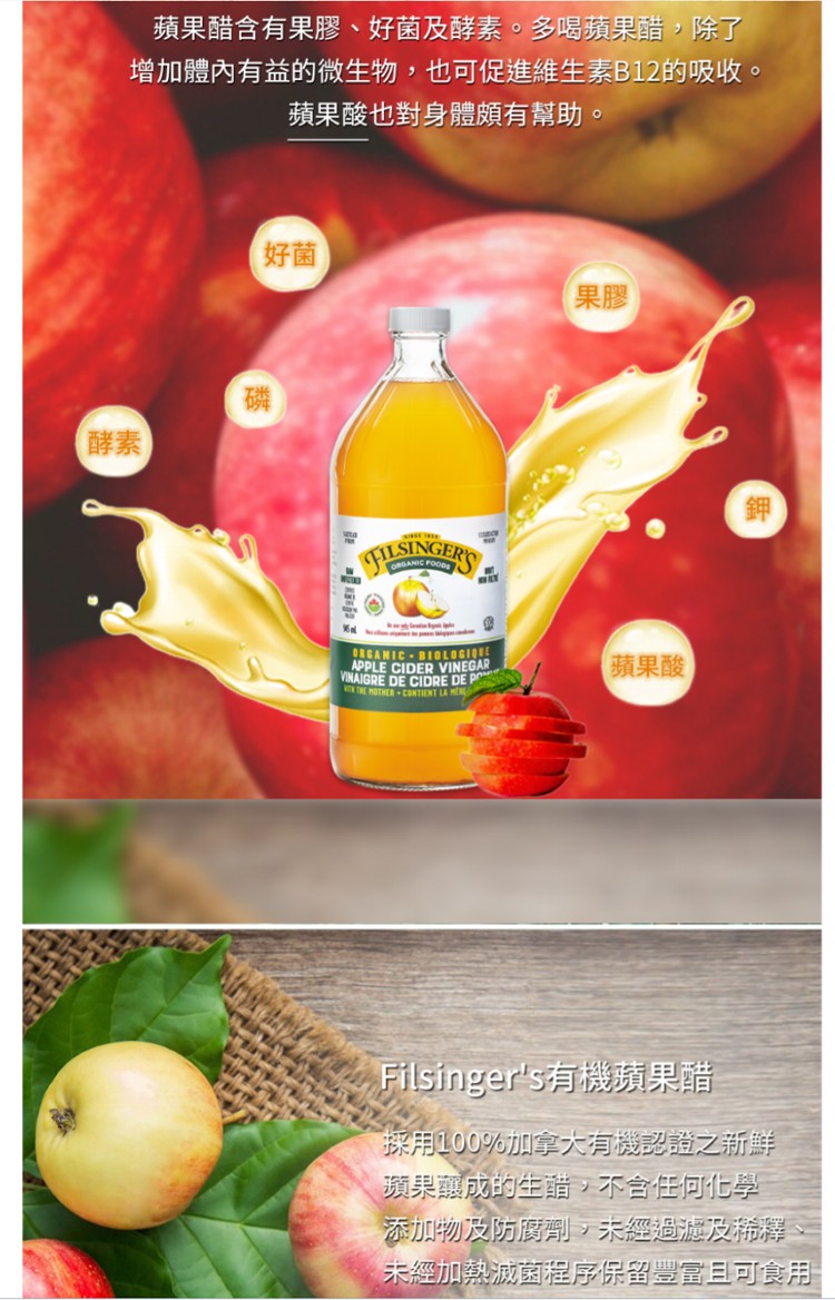 FILSINGERS 有機未過濾蘋果醋 天然發酵製成 無人工添加糖 化學添加劑,