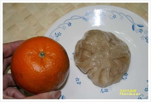 (圖三)和一顆橘子相比。(不難想像它足足是一般水晶餃的5倍大)~
