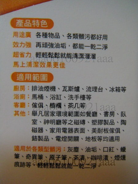 其他:舉凡居家環境範圍如餐廳、書房、臥室、神明廳等之磁磚、塑膠製品、陶瓷器、家用電器表面、美耐板傢俱、鉻製品、電燈開關、門窗、地板等均適用