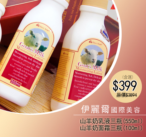 3. 【伊勒安卓】價值3894元澳洲山羊奶淨白保濕乳液(550ml/瓶)+澳洲山羊奶淨白保濕面霜(100ml/瓶) 133元/組(照3組買價399元,拆開來轉讓) 轉讓共2組