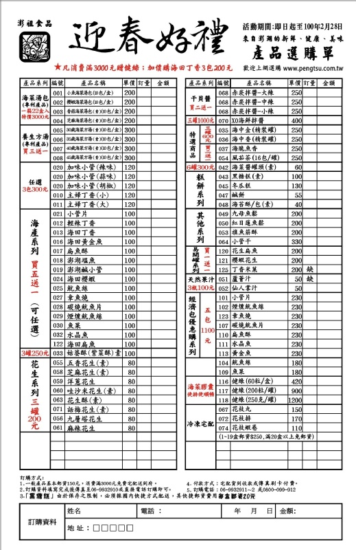 由於產品繁多,請自行上網"澎祖食品"參考,或參考以下產品選購單