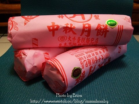 就是這樣一條~~粉紅紙包裝~非常的古早味!!~~ 切開是滿滿的綠豆餡