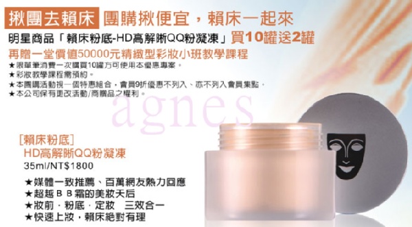 各位團友大家好, 昨天看到電視麻辣天后宮介紹歌劇魅影彩妝品牌的賴床粉底--HD高解晰QQ粉凝凍, 妝前+粉底+定妝三效合一超越BB霜的粉底, 看到女藝人現場塗抹示範覺得還蠻自然的, 不會有有上一層厚粉的感覺, 但再讓我眼睛一亮的是換現場一位皮膚黝黑男藝人使用效果是真的有記憶膚色, 且沒有對比死白膚色出現, 讓我很心動想團購, 再去爬文後發現評價還不錯, 希望有興趣的團友一起來團購, 也歡迎其他主購一起開團增湊數量爭取好的團購價格哦! 謝謝!