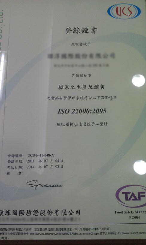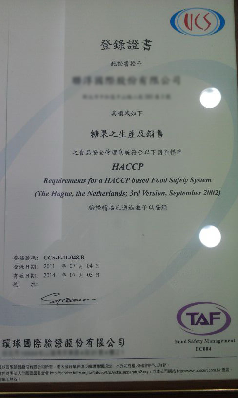 通過ISO22000的認證,五百大企業福委指定年節禮品 haccp認證 ISO22000