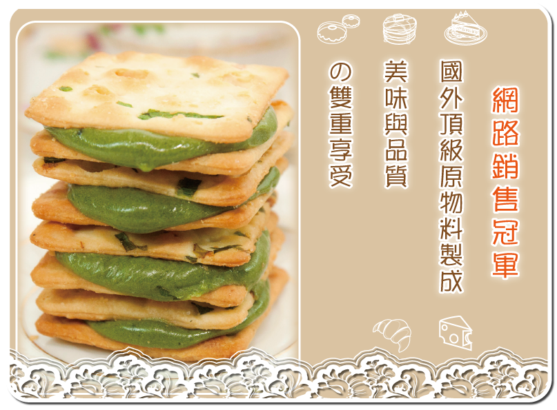 純手工製作,將牛軋糖變成內餡,夾入外層天然酥香鹹脆的香蔥蘇打餅,甜甜鹹鹹的滋味,新奇又獨特,美味不黏牙,蔥多餡多,挑戰餡料最飽滿!