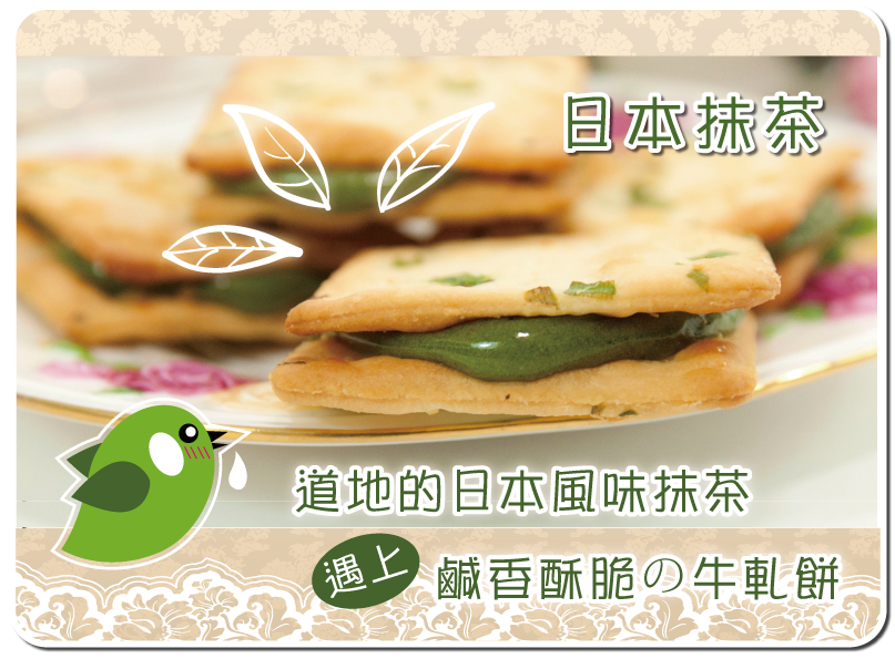 抹茶內容物: 麥芽糖、砂糖、奶粉、麵粉、棕櫚油、青蔥、鹽、酵母、綠茶粉