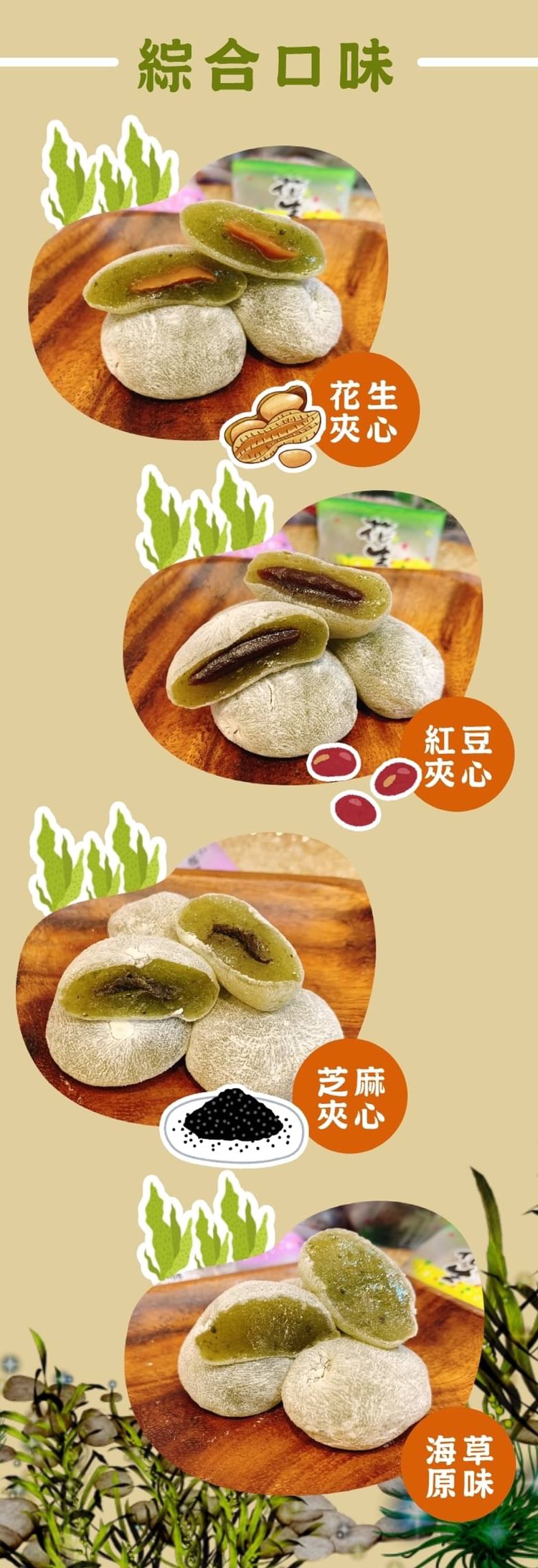 將海草揉入糯米製成麻糬,口感Q彈、帶有淡淡海草香,搭配不同餡料,但同樣紮實,滿足各口味愛好者。