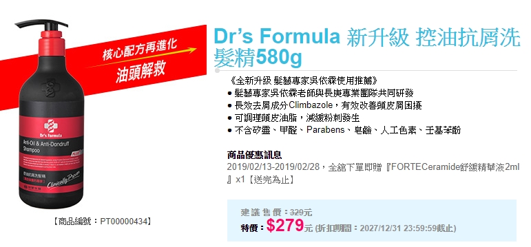 《台塑生醫》Dr’s Formula控油抗屑洗髮精升級版580g