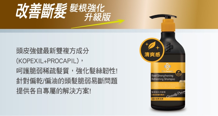 ●運用頭皮強健最新雙複方成分(KOPEXIL+PROCAPIL),賦予頭皮適度滋養,促進健康頭皮環境,強化髮絲韌性,減緩毛髮脆弱易斷及老化等問題。