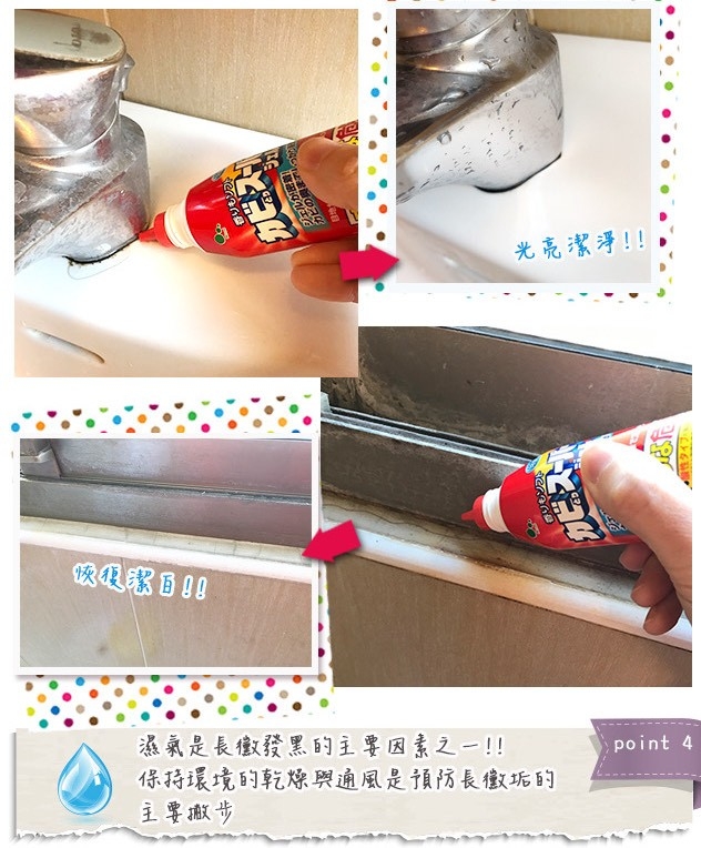 洗手台、廚房水槽、磁磚接縫等潮濕長黴的污垢