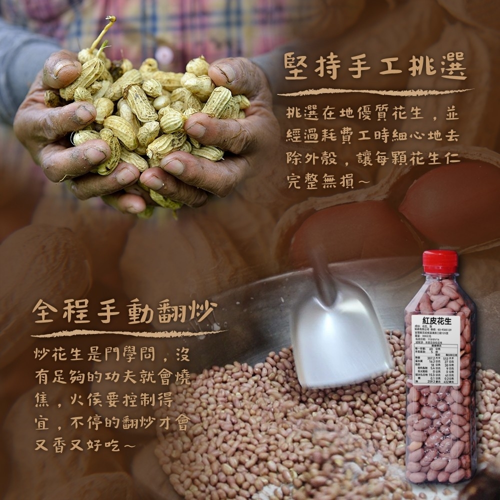 1️⃣ 紅皮花生:選用營養較高的紅皮花生,高甜度,經手工細心翻炒後,濃郁香甜。