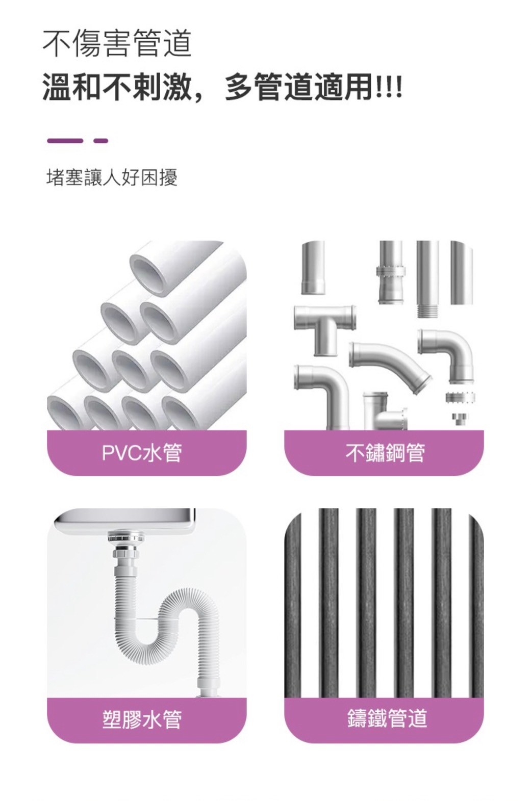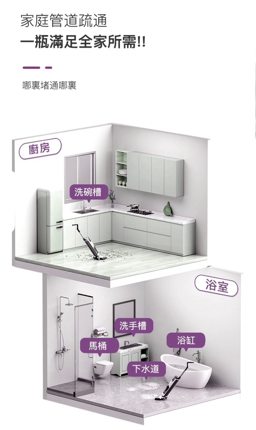 (毛髮、毛屑,流水慢速或不通,倒入整瓶靜待1小 時,廚房汙水管卡陳年油垢,倒入整瓶靜待3小時)
