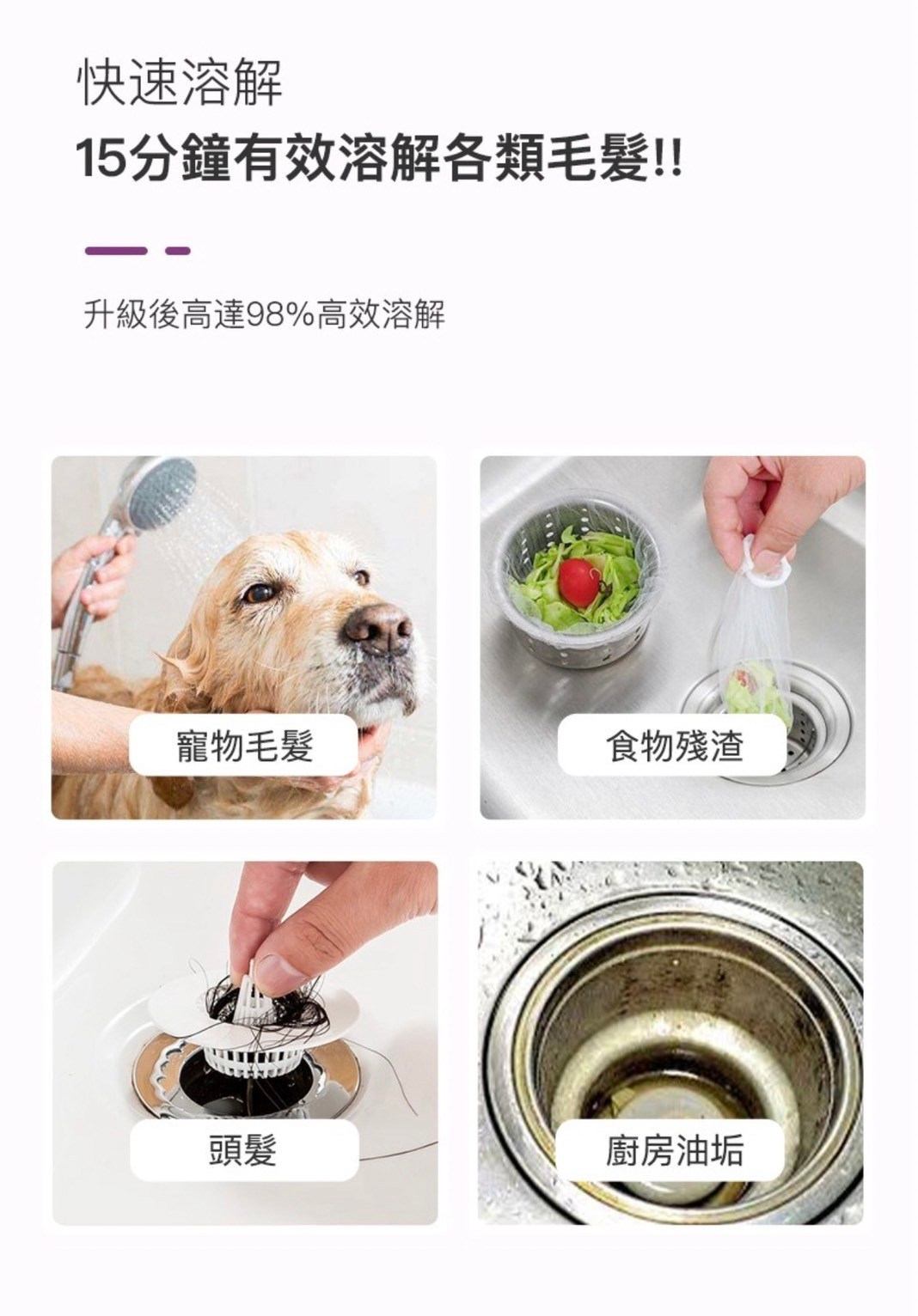 迅速化解疏通管道內壁處凝結 的油垢、毛髮、菜葉殘渣、寵物毛髮 !