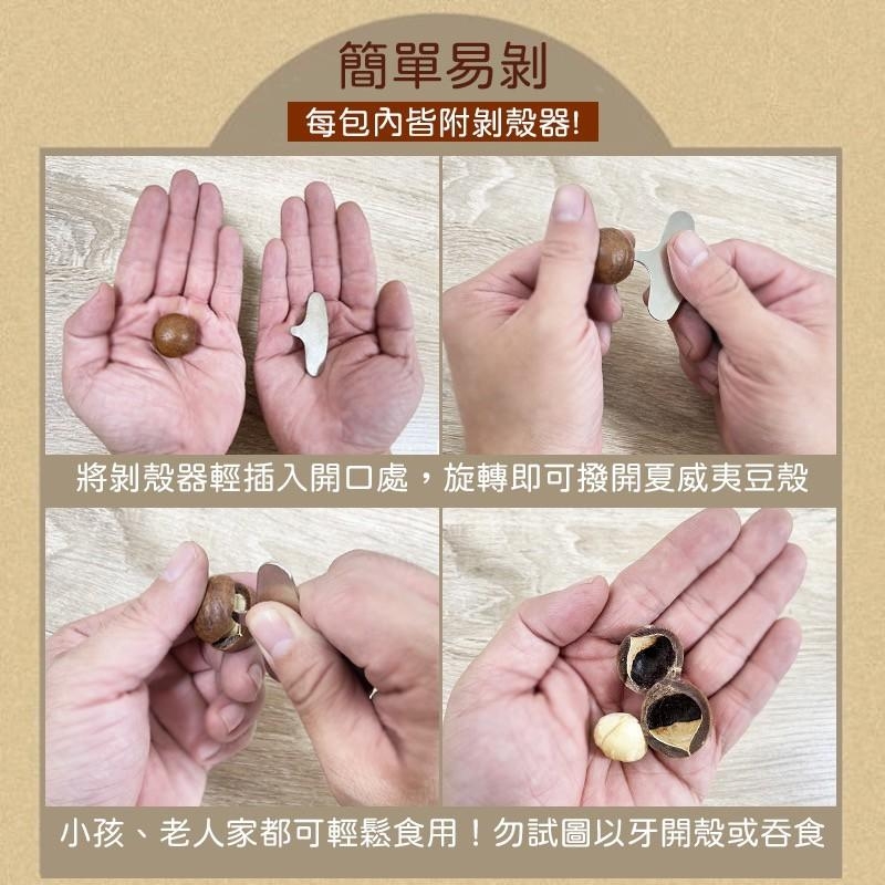 ✔️每包內皆附剝殼器,將剝殼器輕插入開口處,旋轉即可撥開夏威夷豆殼,