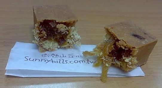 微熱山丘的鳳梨酥是用南投八卦山產的鳳梨慢慢熬煮而成, 和市面上加冬瓜糖的鳳梨酥完全不同,雖然1個$35元有 點小貴,但是他們家的吃起來有著自然微酸甜的好滋味,真 的是手工熬煮100%純鳳梨內餡而且看的到ㄧ根根鳳梨喔 ,再加上日本高級麵粉、在地土雞蛋黃和紐西蘭安佳頂級奶 油製成的酥皮,口口都能感受到真實用料