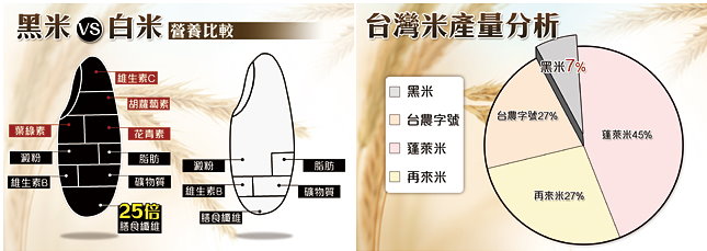 台灣米類中黑米僅生產7%珍貴 ,滋補作用佳 因此被稱補血米。