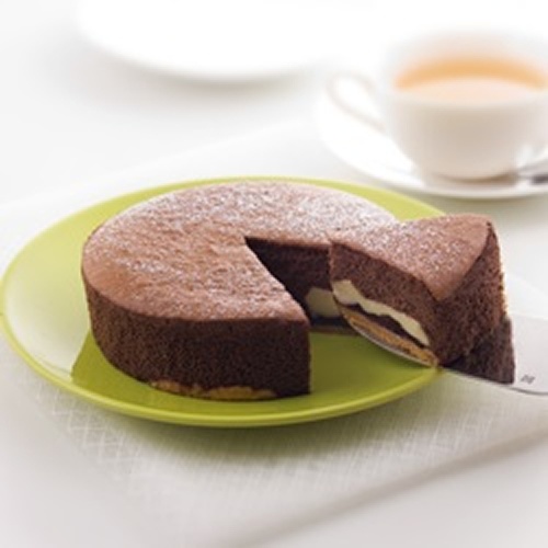 巧克力蛋糕夾進口藍莓餡與原味奶凍,底層搭配酥脆餅乾。
