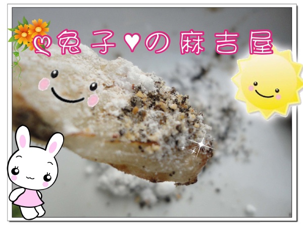 入口前淋上煉乳後沾裹花生粉或芝麻粉,好吃的麻糬燒就完成了。