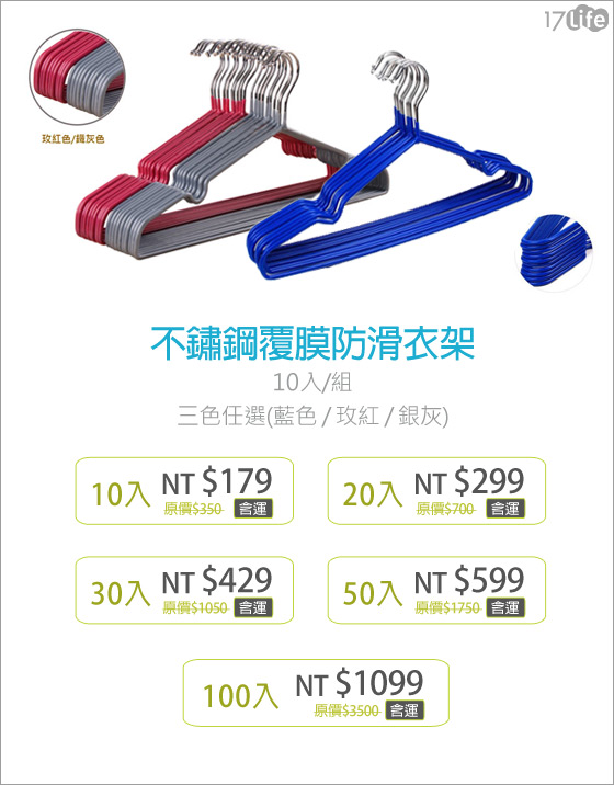 合購介紹 徵10組,這裡最便宜喔! 每支只要11元 | 不鏽鋼覆膜防滑衣架---1組10入