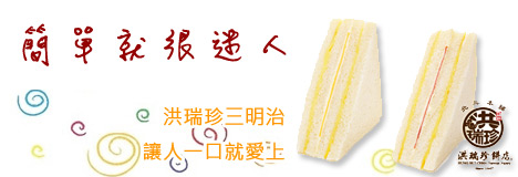 令人大讚美味的【洪瑞珍】 三明治,外層為口感綿密的白吐司或全麥土司,而內層則以簡單的美乃滋、奶油比例,內含起司、火腿、薄蛋,全產品採取低鹽、低鈉養生輕食原則,以最平凡食材、單純口味,用心製做出最不平凡的幸福滋味。