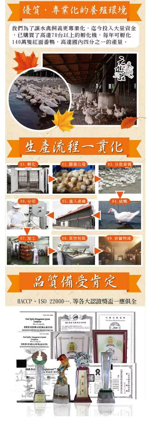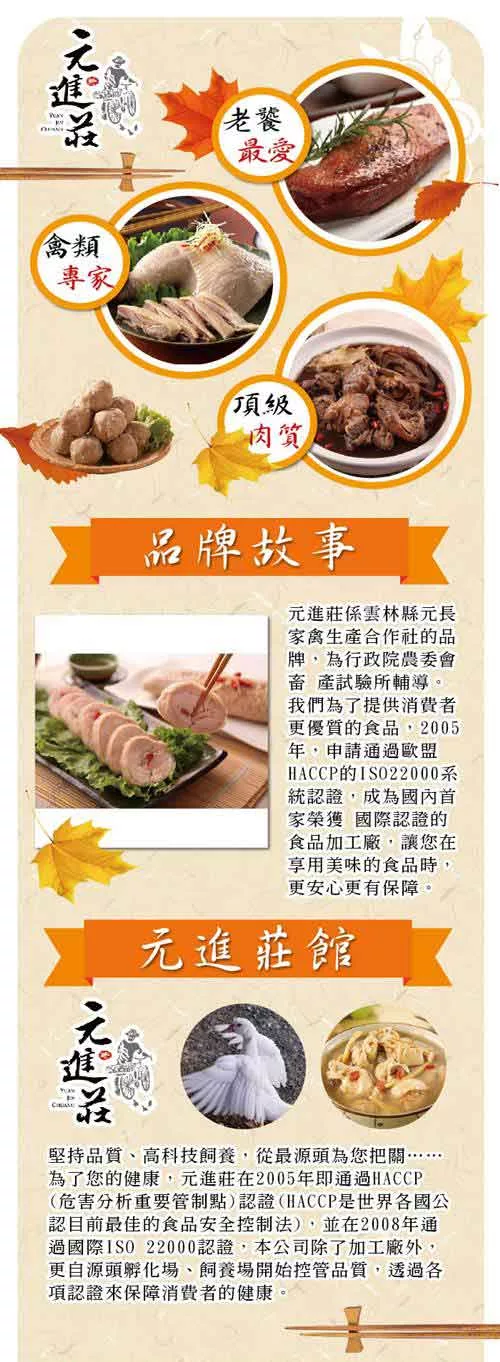 元進莊所採用的雞肉為台灣特有品種「紅羽土雞」,由合格屠宰場提供之雞隻作為原料以確保加工品安全來源.