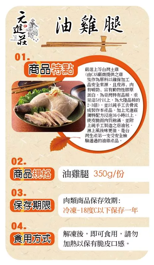 油雞腿是銷售最好的一支產品,選用上等土雞腿肉,經多道工序去除腿骨後,以古法醃漬入味,在食用時淋上頂級特製的油包,吃起來皮脆肉Q清爽不油膩.