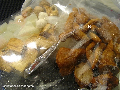 家庭號的賽門甜不辣,裡頭有 高湯*1、甜不辣醬包*3、辣椒醬包*1、A 包(貢丸*3、魚丸*3、竹輪*3、油豆腐*9、菜頭*9)、B包(雞捲*3、片狀甜不辣*3、手指甜不辣*15、炸餛飩*3),也有很清楚的內容物與烹調方式說明。整個包裝非常的乾淨不油膩。另外,這些甜不辣食材,在店裡保存時應該都只是冷藏,因為拿到時都還很有彈性。