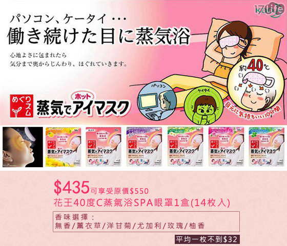 宅配:只要435元即可購得原價550元40度C蒸氣浴SPA眼罩(14枚):無香/薰衣草/洋甘菊/尤加利/玫瑰/柚香。