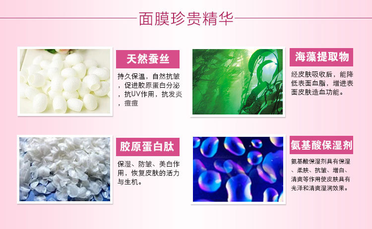 配料成分:玻尿酸、水解胶原蛋白、熊果苷、天然蚕丝等
