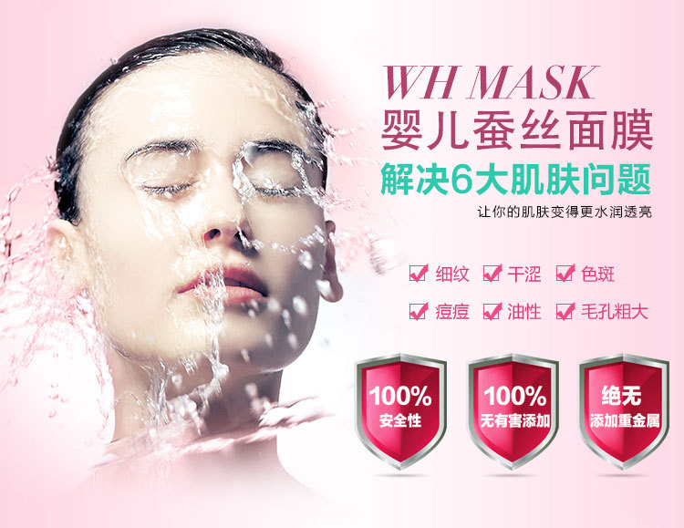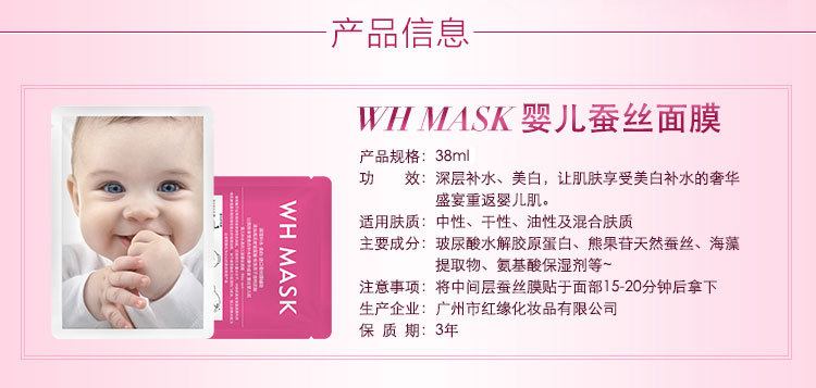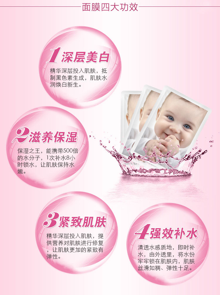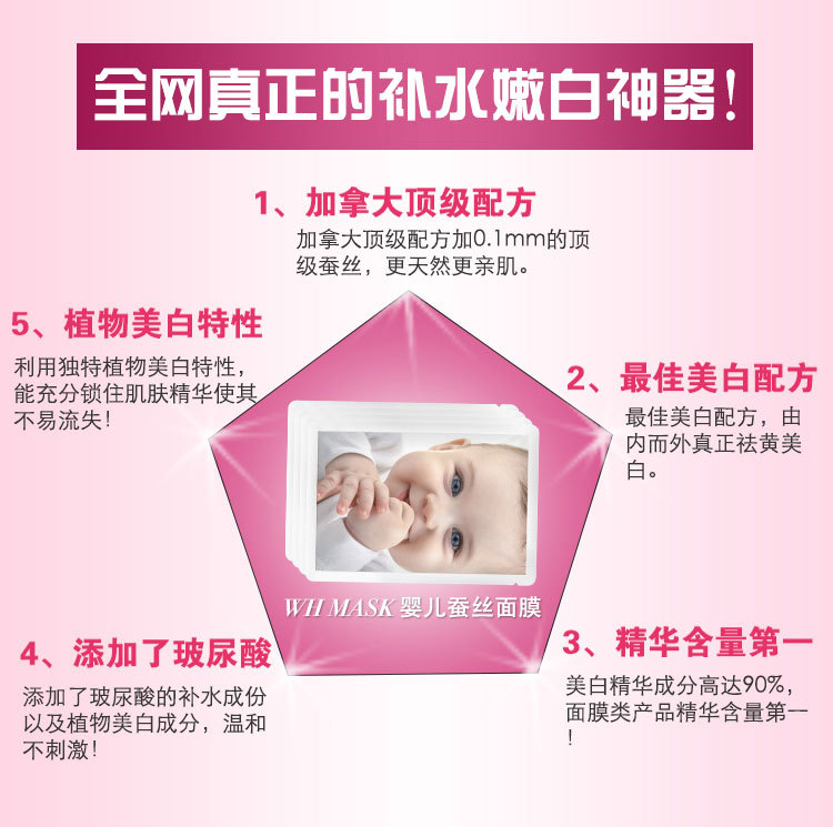 宝贝功效:深层美白、补水、进口蚕丝辅助,添加高浓度玻尿酸,保湿因子透明质酸,让肌肤享受美白补水的奢华盛宴重返婴儿肌!