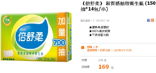 1. 《倍舒柔》 超質感抽取衛生紙 (150抽*14包/串)-135元