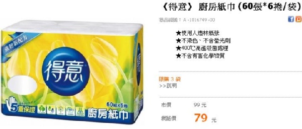 3. 《得意》 廚房紙巾 (60張*6捲/袋)-75元