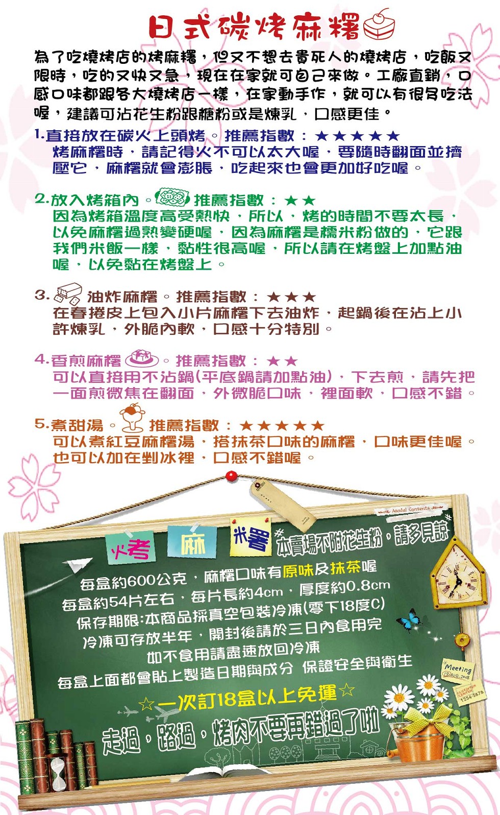 工廠直營保證跟各燒烤店的烤麻糬口感一樣,只要放上烤肉架等個幾分鐘便會膨脹,呈現外酥脆內軟Q的口感,烤的時候稍微壓一下,會變得更膨唷!