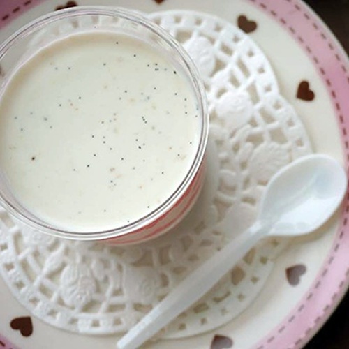 貼心小叮嚀:黑色點點為天然的香草籽,請安心食用。而奶酪在凝固前為液態,所以比重問題,香草籽會浮在表層與底層,主要香草夾與牛奶經過加熱程序,讓天然香草夾完全融入法式奶酪裡,而本身的香草籽,只剩’噗滋噗滋’