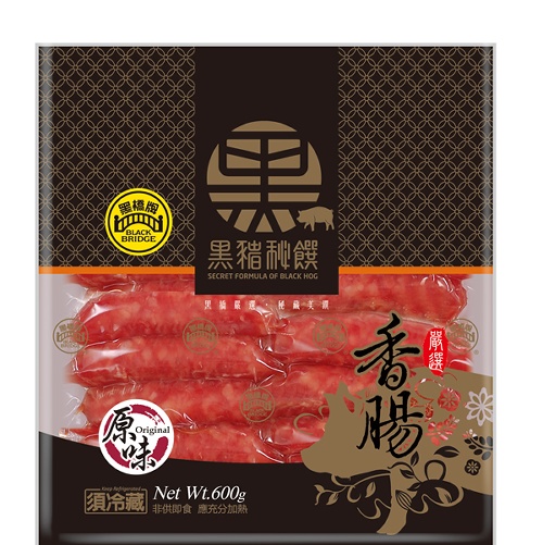 黑橋牌黑豬肉香腸嚴選彈性佳CAS黑豬後腿肉搭配天然腸衣,輔以老師傅精煉 純熟的刀工加上黑橋傳家配料醃製48小時以上。不摻粉、不加色素、全面拒 絕防腐劑,真實呈現飽滿肉質的原產風味,並採用二分肥、八分瘦的肉質比例 充填,口感Q實彈性佳,汁香味美口感十足,是黑橋牌傳承五十餘年的好味道。
