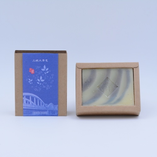 大青葉百年以來是台灣山區常見的藍染與藥用植物。三峽藍染使用的大青葉質純無毒,經三峽在地文史學者林老師推薦,我們將此原料運用渲染手法與冷製作皂工藝,細心選料手作製成三峽大青皂,再經過45天以上室內晾皂熟成,始於2016年三峽老街百年節慶時推出,別具意義。