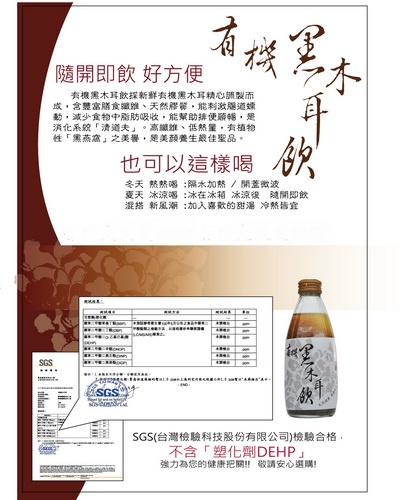 天然的堅持!玻璃瓶安全、無毒、美味的保證!本會所生產之「有機黑木耳飲」堅持以有機黑木耳及有 機晶冰糖製造而成,絕不添加防腐劑及任何塑化劑等,並且堅持使用玻璃瓶,杜絕雙酚A及其他塑膠性的干擾,為讓消費者安心食用,本會已將「有機黑木耳飲」送交具國際公信力的SGS檢驗公司(台灣檢驗科技股份有限公司)檢驗完成確認通過!