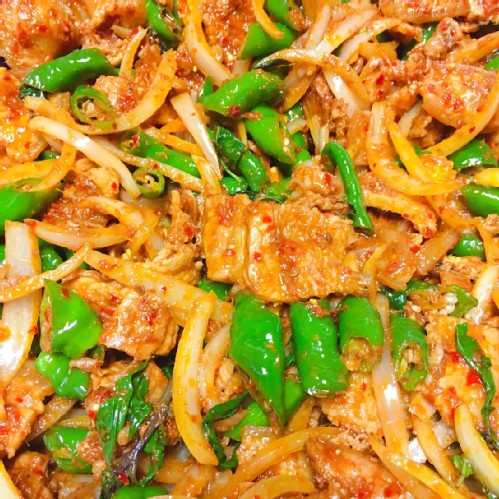 主要食材:五花肉片、玉米筍、青龍椒(糯米椒)、洋蔥、泰國辣椒醬