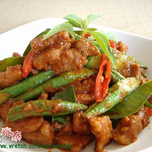 主要食材:梅花肉片、長豆(菜豆)、檸檬葉、咖哩醬 (遇長豆缺貨 會以時蔬取代)