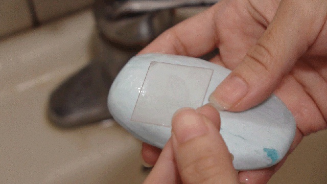 拿起肥皂,對著魔利貼,輕輕地塗抹一番,好好的清洗一下!
