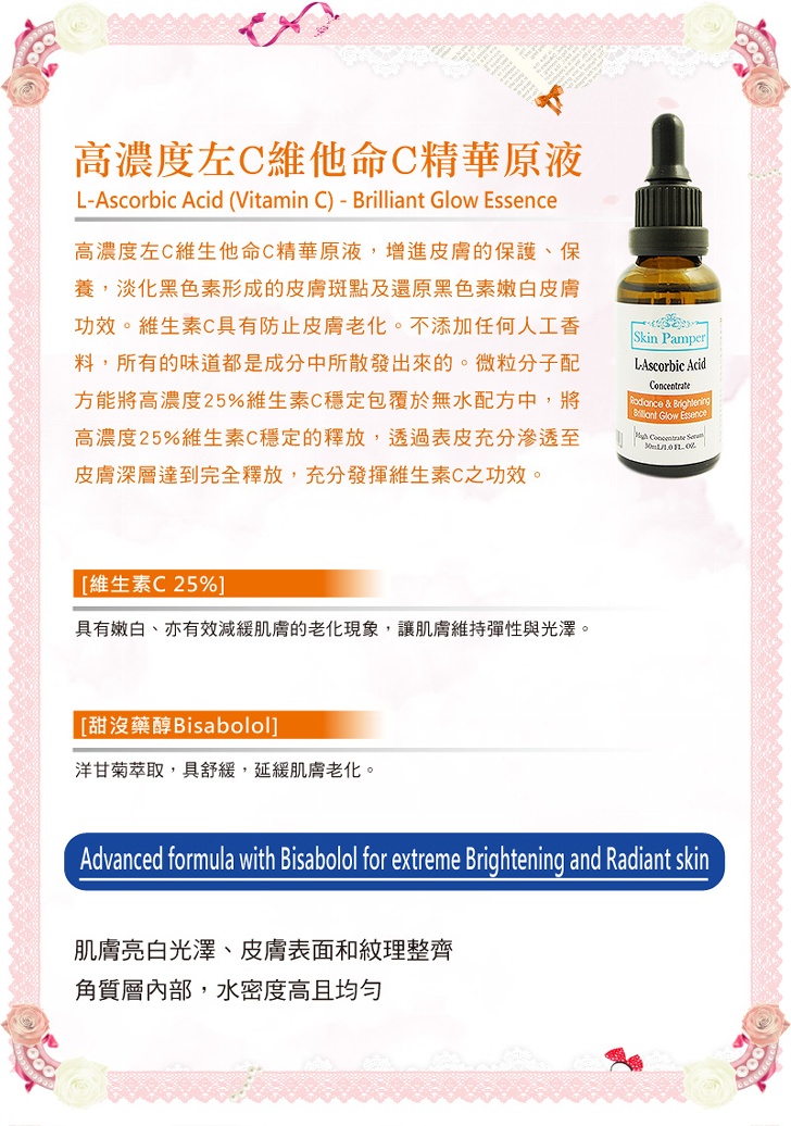 25%高濃度左C維他命C精華原液" 淡化黑色素及皮膚斑點,改善肌膚暗沉及提高肌膚的明亮度!