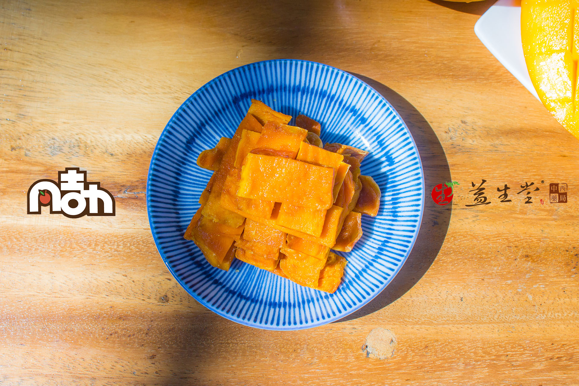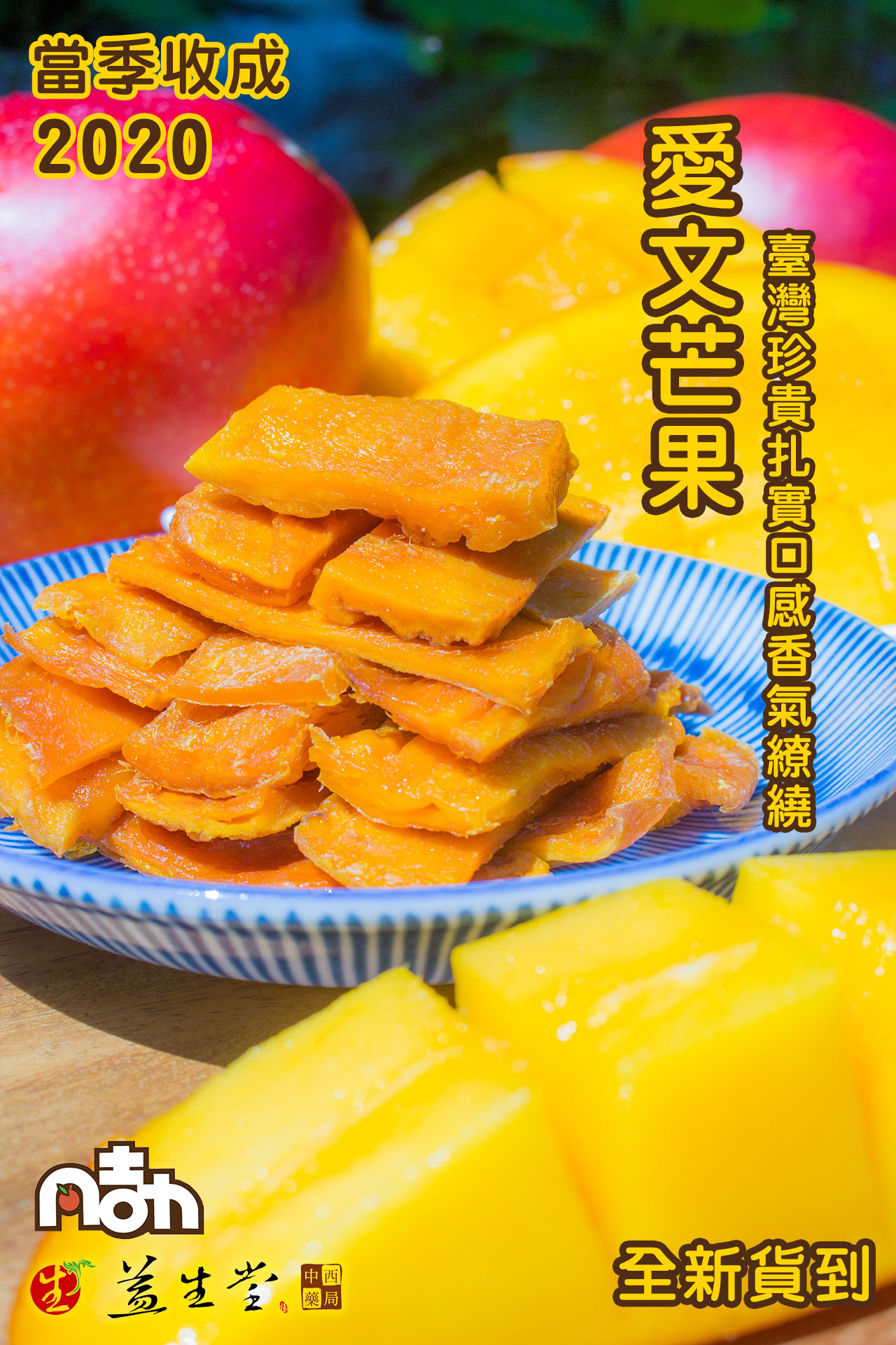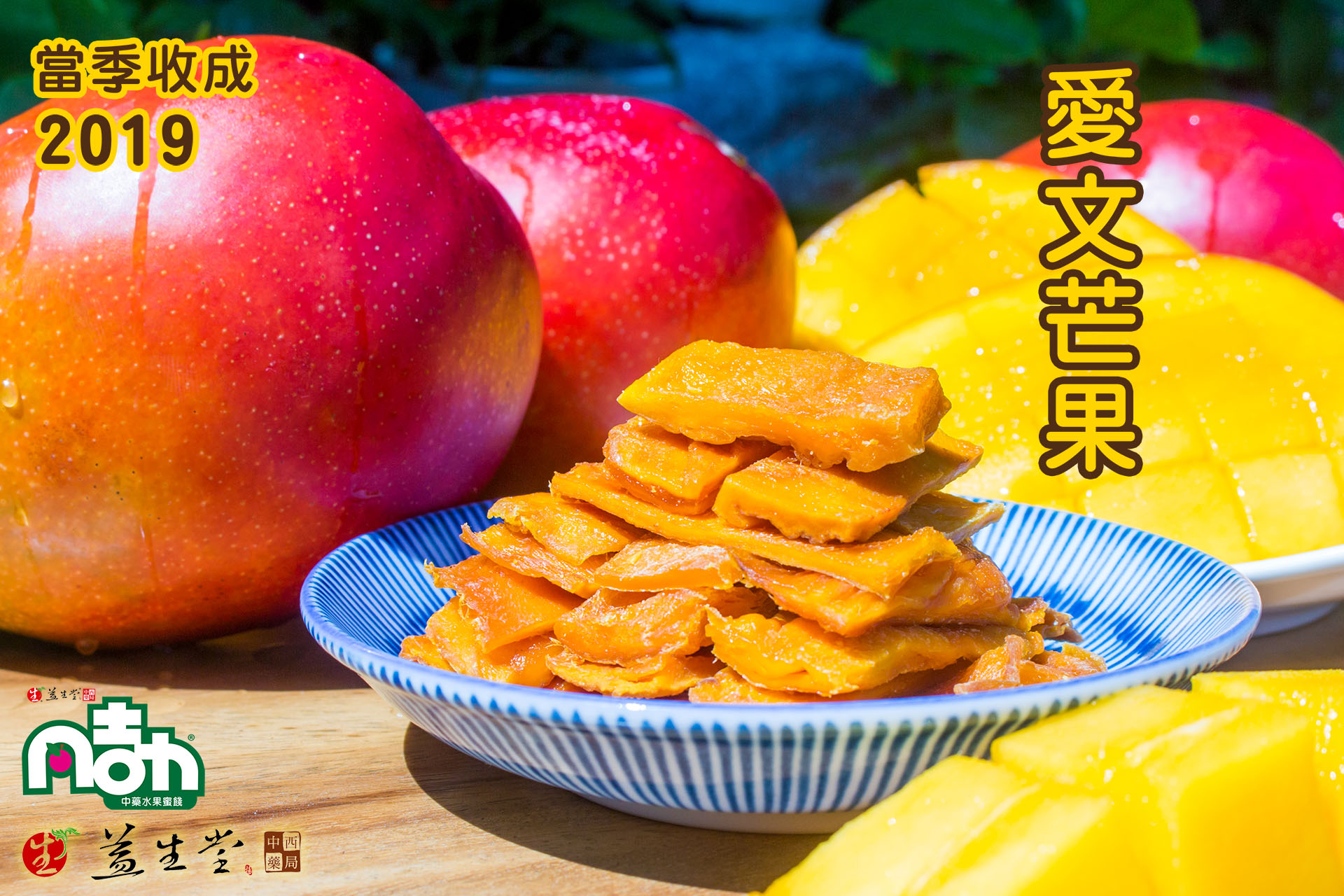 (此圖,本產品爲前方調製乾燥製作後的愛文芒果干。後方愛文芒果水果爲原始製作前水果) 芒果因具有速生、早產、高產 果實風味獨特、營養豐富,經濟效益高等特點 使得芒果生產不斷得到發展。 目前已成為繼葡萄、柑橙、香蕉、蘋果之後的世界第五大水果。
