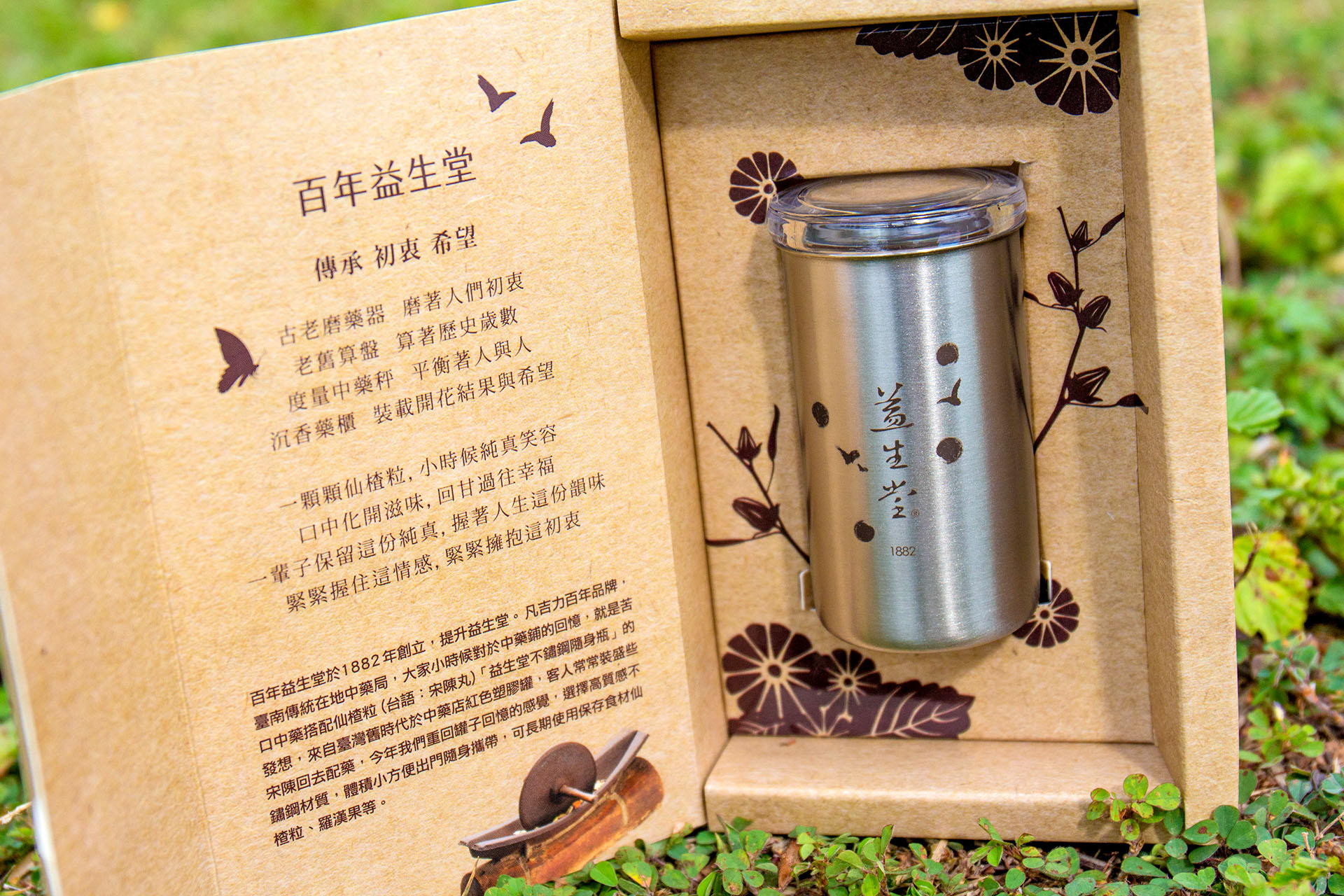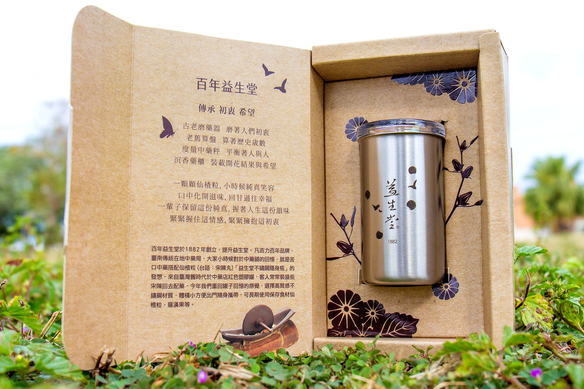 百年益生堂於1882年創立 提升益生堂。凡吉力百年品牌,臺南傳統在地中藥局 大家小時候對於中藥鋪的回憶,就是苦口中藥搭配仙楂粒 (台語:宋陳丸) 「益生堂不鏽鋼隨身瓶」的發想,來自臺灣舊時代於中藥店紅色塑膠罐,客人常常裝盛些宋陳回去配藥,重回罐子回憶的感覺,選擇高質感不鏽鋼材質,體積小方便出門隨身攜帶,可長期使用保存食材仙楂粒、羅漢果品質穩定。